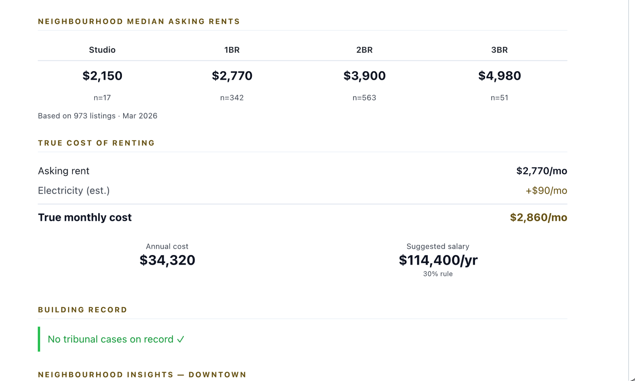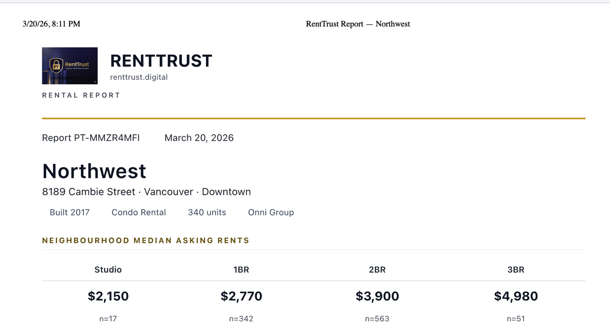 A real RentTrust report for a condo in Downtown Vancouver. This is what a premium report looks like.
